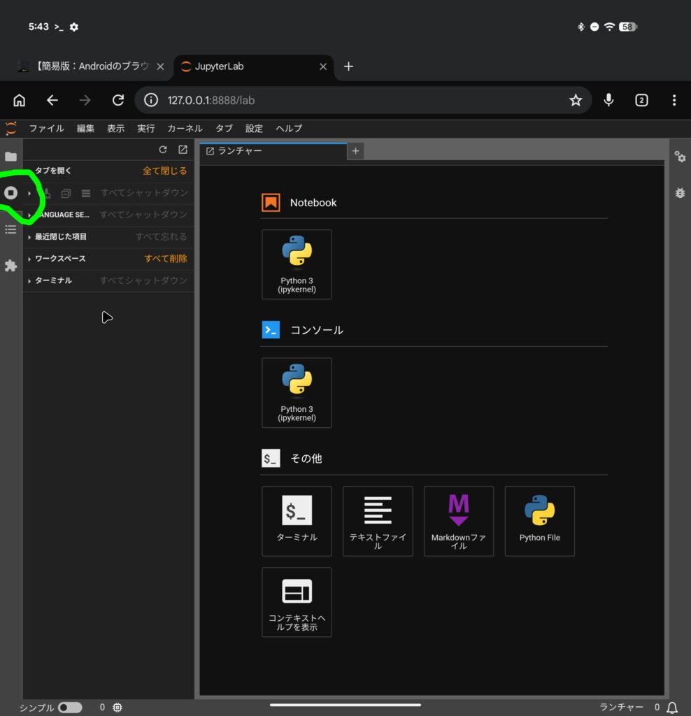 インストールできたらJupyterlabを起動しますが、起動場所がjupyterlabのルートディレクトリになるので、今回は、Androidの内部ストレージをルート(/mnt/shared/)として起動したいと思います。